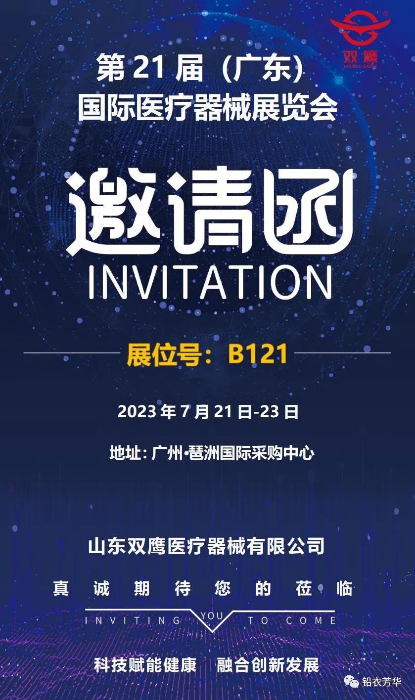 2023年7月21日-23日,第21屆(廣東)國(guó)際醫(yī)療器械展覽會(huì)在廣州·琶洲國(guó)際采購(gòu)中心隆重舉行,雙鷹醫(yī)療在B121號(hào)展位恭候您的光臨!