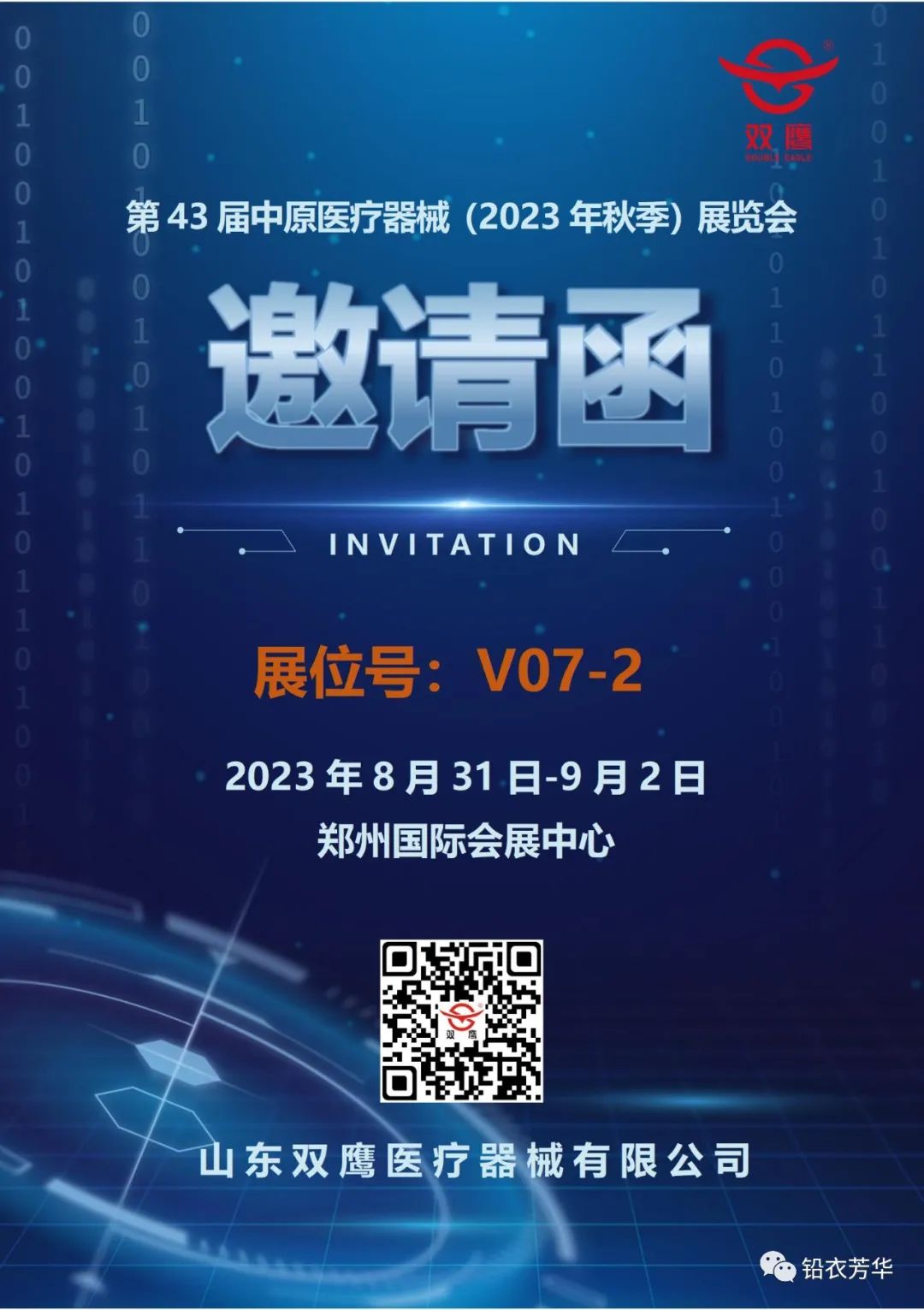 2023年8月31日-9月2日,第43屆中原醫(yī)療器械(2023年秋季)展覽會(huì)在鄭州國(guó)際會(huì)展中心隆重舉行,屆時(shí),雙鷹醫(yī)療在V07-2號(hào)展位恭候您的光臨!