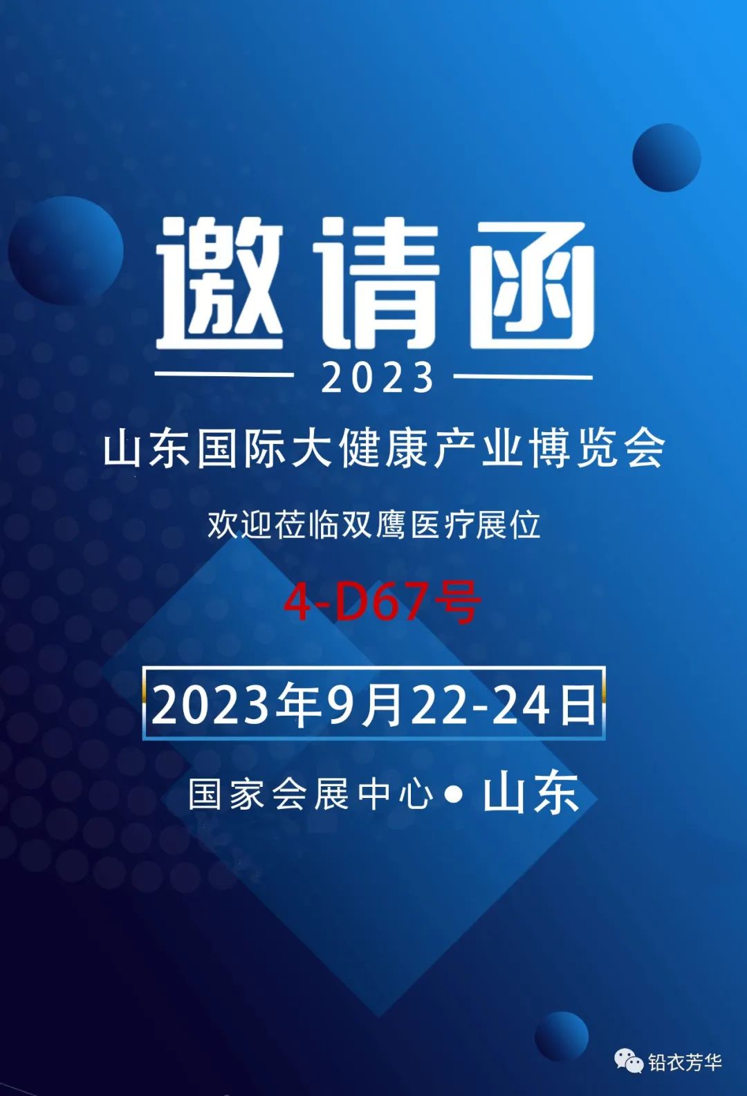 2023年9月22日-24日,2023山東國際大健康產(chǎn)業(yè)博覽會在山東國際展覽中心隆重舉行,屆時雙鷹醫(yī)療在4-D67號展位恭候您的光臨!